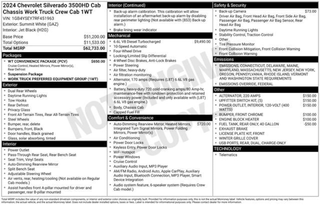 The 2024 Chevrolet Silverado 3500HD Work Truck in Summit White is a robust and capable vehicle designed to meet the demands of tough jobs. Its powered by the Duramax 6.6L V8 turbodiesel engine, paired with a 10-speed automatic transmission, delivering exceptional power and towing capabilities. With 4WD, this truck ensures dependable performance on a variety of surfaces, whether on or off-road.