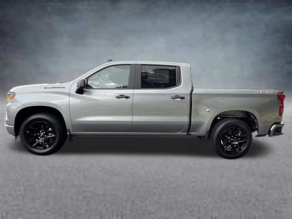 The Sterling Gray Metallic exterior gives the Silverado Custom a sharp, refined appearance that complements its rugged stance. Accents like the Dark Essentials Package and Black nameplates (LPO) add a distinctive touch, while functional elements such as front frame-mounted black recovery hooks, LED cargo area lighting, and the EZ Lift power lock and release tailgate enhance its utility. Deep-tinted glass further adds both style and privacy.