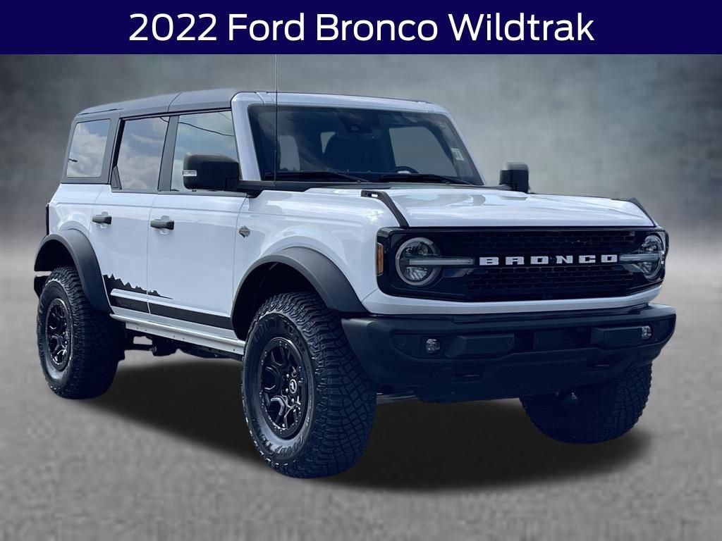 The 2022 Ford Bronco Wildtrak in Oxford White is a rugged yet refined 4WD SUV equipped with a robust 2.7L EcoBoost V6 engine and a smooth 10-speed automatic transmission. Its exterior combines toughness and style, while the interior features a sophisticated blend of Medium Sandstone and Black Onyx cloth bucket seats that offer comfort for off-road adventures or daily driving.