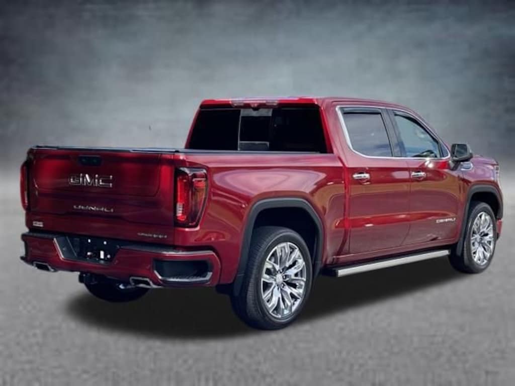The 2024 GMC Sierra 1500 Denali in Volcanic Red Tintcoat combines unmistakable style with premium capability, powered by the commanding EcoTec3 6.2L V8 paired with a smooth 10-speed automatic transmission and 4WD. Its presence is elevated by a signature Denali chrome grille, chrome recovery hooks, chrome wheel-to-wheel assist steps, and bold 22-inch painted aluminum wheels, while functional touches like LED cargo area lighting, a spray-on bedliner with Denali logo, and the versatile GMC MultiPro Power Steps add both convenience and utility.